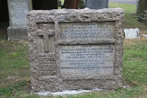 Russell died in Edinburgh on 11 August 1940.[2] He is buried in the grave of his father-in-law, James Ritchie (1828-1913) in Dean Cemetery. The grave lies near the south path of the Victorian north extension and was restored in the winter of 2017/18.