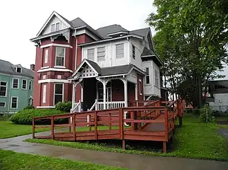 Known in upstate New York as "The Strawberry Mansion" (for its distinct red brick facade), this historic home was built in about 1880 and designed by Thomas Gerity, a well-known regional architect of the day. A large two-story, brick and stone Queen Anne style dwelling of almost 8,000 square feet, the home showcases classic wood moldings, 12 foot etched ceilings, and original pocket doors. It features an irregular cross-gabled massing and high gable roofs, as well as a large bracketed entrance porch, second story balcony, and projected semi-octagonal front bay.[2]
