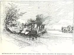 At the Battle of Belmont on November 7, 1861, when Grant's horse was shot from under him, Hillyer offered Grant his mount and Grant continued to lead.[13] During the retreat to the transports on the river after the battle, Grant had been searching for one of his regiments that was missing, but with the Confederates advancing, Grant sped to the landing and found that the boats' captains had already cast off the mooring lines. Grant wrote in his memoirs: