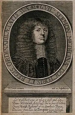 William Sermon, born probably in 1629, was "nearly related" to one Edmond Sermon, a native of Naunton-Beauchamp, Worcestershire. He seems to have gained his first medical experience "in the armies". About April 1666 his "occasions" called him to Bristol, "and the physicians there leaving the city", owing to the plague, he was, by desire of the mayor, "shut up at the Mermaid Tavern upon the Back, and after that at Mr. Richard Winstone's house in the county of Gloucester, near the city aforesaid, in which infected houses", he says, "I continued the space of three months, and cured all of the Pest that took my Directions". He now obtained "a sufficient practice upon the worst of diseases", and remained at Bristol till 8 June 1669, when he was summoned to Newhall in Essex to attend George Monck, Duke of Albemarle, for dropsy. On 12 July Monck gave him a certificate of his cure, and Charles II, on 6 August, sent letters to the University of Cambridge requesting them to grant Sermon a medical degree.[a] In 1670 he accordingly graduated MD.[1]