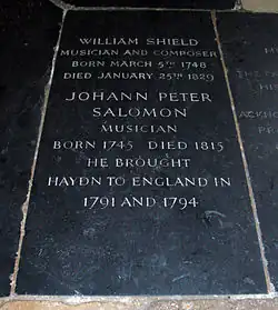 Shield is buried in the same grave as Johann Peter Salomon in the floor of the south cloisters of Westminster Abbey.[5][6] It seems no marker of any kind was put in place at the time to show where he lay. There was quite a search made near the centenary of his death and eventually a small marble tablet was put as near the grave as could be ascertained.