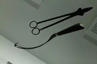 He also designed an improved version of the obstetrical forceps, which had been recently revealed after the midwifing Chamberlen family had kept it secret for generations.[4] He publicized the use of these instruments although he promoted natural birth as the best method of delivery due to its less invasive nature. In his new version of the forceps, Smellie shortened and curved the blades and included a locking mechanism.[5] In addition, he described the mechanism of labour, devised a maneuver to deliver the head of a breech, and published his teachings. He was the first person to document the natural birthing process and detailed the method by which the head of the child exited the female pelvis.[6][7]