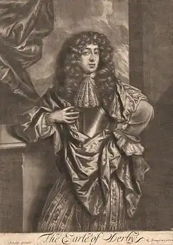 He succeeded his father in the earldom in 1672[1] and later served as Lord Lieutenant of Lancashire from 1676 to 1687 and again from 1688 to 1701 and of Cheshire from 1676 to 1687. In 1685, Derby petitioned the House of Lords for the restoration of some of the family estates that had been seized from his late father, including the manors of Hawarden, Bidston, and Broughton, Lancashire.[2]