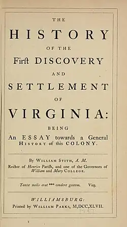 - ^ "Discovery: Stith History of the First Discovery and Settlement of Virginia". The Colonial Williamsburg Foundation. 2008. Retrieved June 1, 2008.
