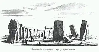 It was while at Avebury in 1723 that he began a draft of the History of the Temples of the Ancient Celts.[53] This work drew upon his fieldwork at both Avebury and Stonehenge as well as his field-notes from other prehistoric sites and information obtained from the 'Templa Druidum' section of Aubrey's Monumenta Britannica. The work also cited Biblical and Classical texts.[70] In the book, Stukeley discussed how prehistoric people might have erected such monuments using sledges, timber cradles, rollers and leavers.[71] He devoted much space to refuting the suggestion, made by Inigo Jones and J. Webb, that Stonehenge had been erected by the Romans, instead attributing it to the prehistoric—or as he called it, "Celtic"—period.[72] The druids are mentioned only briefly in the book, when Stukeley suggested that they might be possible creators of the stone circles.[70]