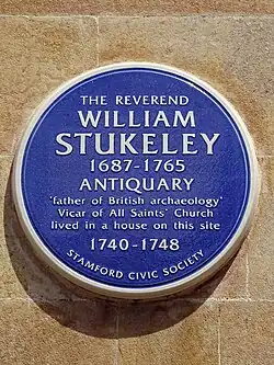 Blue plaque devoted to Stukeley erected in 2010 in Stamford, Lincolnshire