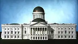 The painter John Trumbull handed in William Thornton's still "unfinished" revised plan of the Capitol building on January 29, 1793, but the President's formal approbation was not recorded until April 2, 1793. Thornton was inspired by the east front of the Louvre, former royal palace later turned art museum, as well as the Pantheon, famed former Roman temple in Roma and later converted to a Christian church, for the center portion of the design.[8] After more drawings were prepared, enthusiastic praise of Thornton's design was echoed by Secretary of State Jefferson: "simple, noble, beautiful, excellently distributed." For his winning design, Thornton received a prize of $500 and a city lot.[9]