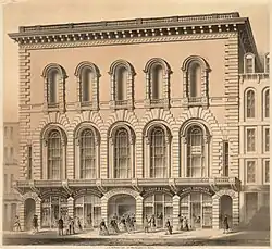 Washburn's Boston hotels included the American House (1851, demolished), the Parker House (1855 et seq., demolished) and Young's Hotel (1860, demolished).[1] For Paran Stevens he completed the interiors of the Fifth Avenue Hotel (1859, demolished) in New York City, originally designed by Griffith Thomas.[10] His obituaries also credited him with the Hotel Victoria, built by Stevens in 1872 as an apartment hotel from plans by Richard Morris Hunt and converted into a commercial hotel in 1879.[1][11] Moses Washburn was his representative in Saint John, New Brunswick, where he designed the Victoria Hotel (1871, burned in 1877)[12] and the Academy of Music (1872, burned in 1877).[13]