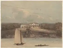 The arrival of Investigator at the settlement at Port Jackson (now Sydney) on 8 May 1802 seems to have revitalised Westall. During there ten-week hiatus there, he produced a great deal of work, including no fewer than thirteen detailed drawings of the Hawkesbury River, with which he was much taken. He also sketched some local Aborigines, and was commissioned by the Governor, Phillip Gidley King, to paint Government House. The resulting watercolour is one of a very few paintings that Westall completed during the voyage.[13]