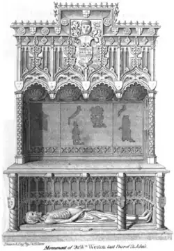 Sir William Weston (c. 1470 – 7 May 1540) was the last Prior of the Order of Knights of the Hospital of Saint John of Jerusalem in England before the Dissolution of the Monasteries, during the reign of King Henry VIII.[2][a] As such he ranked as Premier Baron in the roll of peers. He is characterised as one of the influential adherents of the papacy.[3] His cadaver effigy survives in the crypt of the Priory Church of St John, Clerkenwell in Middlesex (now in central London), the former headquarters of the Order.