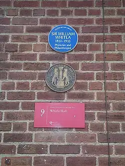 During Whitla's lifetime his gifts to his profession included the Good Samaritan stained glass window (commemorating the heroic behaviour of two Ulster doctors) erected in the Royal Hospital, and a building to house the Ulster Medical Society. At his death Lennoxvale was bequeathed to Queen's University as a residence for the Vice-Chancellor. The university also was his residuary legatee, and acted on his suggestion that the available funds should provide an assembly hall. The Sir William Whitla Hall was opened in 1949,[2] and now bears a plaque commemorating him.