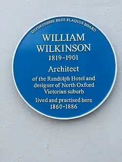 Wilkinson designed Home Farm on the Shirburn Castle estate, built in 1856–57.[16] From 1860 he laid out the Norham Manor estate in north Oxford.[17][18] The estate was slowly developed with large villas, a number of which Wilkinson designed himself.[19] Wilkinson also designed town houses and small country houses elsewhere in Oxfordshire: