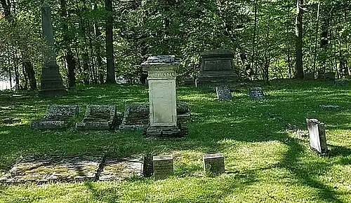 In 1841, while riding topside on a stagecoach, Williams was involved in a severe accident, having been thrown from the top, resulting in a head injury. It left him somewhat mentally impaired from which he never fully recovered, which lead into further financial troubles. His father-in-law Henry Huntington, died the next year, and left Williams and his wife a share of his estate. Williams returned to Utica and died in his home at 48 Broad Street, on June 10, 1850, at the age of sixty-two.[62] He was buried there in Forest Hill Cemetery. By that time the population of the village of Utica had increased to over 17,000, while the Utica and Schenectady Railroad Company had long since been established and the Chenango Canal completed. Williams's close friend Thurlow Weed once wrote that, after the death of William Williams, that "as a citizen, he was public spirited beyond his means; his counsel, his exertions, and his purse were ever at the service of any enterprise calculated to benefit the place." Williams's newspapers and maps is said to have aided in the public awareness, support and promotion of many projects that came to fruition in upstate New York.[63][62] Not long after Williams's death, his son, Robert, erected a brass plate next to the pulpit in the Presbyterian church with a eulogy of Williams's memory inscribed on it.[62] Williams's grandson, John Camp Williams, wrote a biography of William in 1906, entitled, An Oneida County printer, William Williams, printer, publisher.[64]