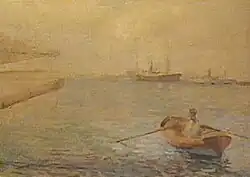 In dark, phantom shades of green and browny yellow W. W. Beling gave us a "View of Dutch Canal". It depicted the charm of turgid yet placid waters, greenery and tender coconut palms. The "padda" house boat almost hiding in the curve of the canal was romantic. "Morning on Tuankai Lake" awakened from the night's slumber was aesthetically beautiful.[10]