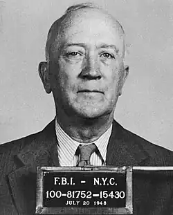 In 1948 Foster was among the party leaders indicted for subversive activity under the Smith Act,[9] but, because of his precarious health, he was not brought to trial.[1] The Party began to implode as a result of these prosecutions, as many Party leaders chose to go underground after the Supreme Court upheld the conviction of the first tier of CPUSA leaders in United States v. Dennis, 341 U.S. 494 (1951). Foster also presided over a number of internal purges.