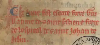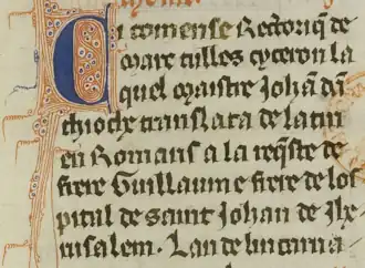 William's other translation project from Latin into French was of certain documents in the archives of the Hospital in Acre, including the order's statutes, prayers and privileges.[1] The translator of this selection of texts is unknown. Possibly it was John.[7] The original copy of these translations is in the Vatican, Biblioteca Apostolica Vaticana, MS lat. 4852. A marginal colophon dedicates the work to William.[9]