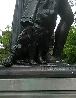 "...with his proper right hand raised to his chest, pointing with his index finger. He holds an open scroll with his proper left hand. A small dog sits at his feet on his proper right. William the Silent wears the clothes of a civilian magistrate of the 16th century. He has a moustache and a beard, and he wears a ruffled collar, an open ankle-length coat, a buttoned vest, and bloomers. The sculpture is mounted on a square base."[11]