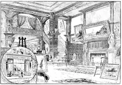 The gallery was located at the corner of Bedford and Washington Street until 1885.[9][10] The gallery moved in 1885 from downtown to Back Bay, where it remained until the business closed around 1907.[11][12][13] "Williams & Everett's Galleries, at No. 79 Boylston Street, were ... designed and built expressly as a repository of the Fine Arts. ... The architectural adornment of the interior is of the English Renaissance, with carved wood and heavy beams in sight. On one side is a carved chimney piece, extending to the ceiling, and near this is a grand staircase leading to a series of galleries, extending from the carved wood coigne which looks down into the store, to the balcony overlooking Park Square. The wainscoting of dark wood is surmounted with pomegranate hangings, and the ceiling is effectively decorated in plain and harmonious tints. Incandescent lights placed in the ceiling in a novel and original manner, are used throughout the store and galleries."[14]