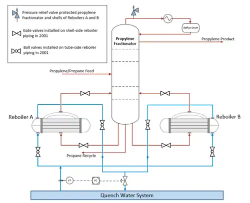 While the reboilers were originally designed to be used concurrently, a modification was performed in 2001 to allow each reboiler to be used independently from the other, allowing a fouled reboiler to be cleaned without shutting the unit down. Valves were installed to isolate each reboiler from the other, and they had the effect of preventing the isolated reboiler from accessing the pressure relief valve at the top of the propylene distillation column.