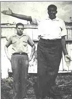 Guicel "Willie" Camper was an American giant who was born in Memphis, Tennessee. He is notable for being one of 29 known people in medical history to have verifiably reached a height of 8 feet (240 cm) or more. By the time of his death at the age of 18, he reached a billed height of 8 ft 7 in (2.62 m).[1] He also wore size 32 shoes.[1] He is the 4th tallest verified man and the 2nd tallest recorded African-American, though likely being the tallest person from the time after Robert Wadlow's death. Robert was 8'11, making him roughly 4 inches taller than Willie.[2][3]