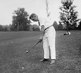 Ogg hitting a fairway wood shot, c. 1920 | |