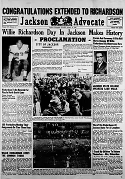 Mayor Allen C. Thompson of Jackson proclaimed January 14, 1963, to be "Willie Richardson Day" in honor of the football star's exploits.[7] Initiated with a parade and a celebratory meeting at city hall, the event was lauded in the city's black newspaper as an event when "for the first time since [Jackson's] founding some 150 years ago, by official proclamation a day was set aside, and the entire city called upon to join the observance and celebration honoring a Negro."[7]