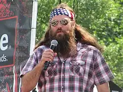 Robertson is known for his Christian faith and often preaches about it to others. He is a member of the Churches of Christ.[9] He is also almost always seen wearing a bandana in the pattern of the American flag on his head, and he often wears a white suit jacket to look more professional,[10] though the jacket has drawn comparisons to The Dukes of Hazzard character Boss Hogg (Willie's Twitter handle is "williebosshog").[11]