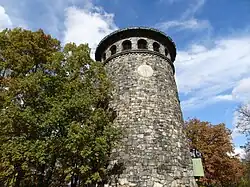 At the top of the hill is one of Wilmington's most iconic landmarks, Rockford Tower. The 115-foot tall stone structure, which was built between 1899 and 1901, serves as both a water tower and an observation tower as its top floor is an observation deck with large arching windows that provide a 360 degree view of the park and the city of Wilmington. The tower is directly across the river from the DuPont Experimental Station, where the company produced gunpowder in the early 20th century. Initially the city could not allow public access to the tower due to liability concerns over the risk of explosions from the gunpowder mills, but now the tower is open to park visitors in season.[12][13]