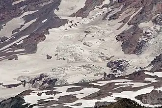 The Wilson Glacier is a medium-sized tributary glacier located on the southeast flank of Mount Rainier in Washington. Named after A.D. Wilson, who was part of an early ascent of Mount Rainier,[3] the body of ice has an area of 0.5 square miles (1.3 km2) and has a volume of 1.9 billion feet3 (54 million m3).[2] The glacier directly feeds ice to the adjacent, but much larger Nisqually Glacier. Starting from the head at 9,700 feet (3,000 m), the glacier flows downhill southward.[4] One part of the glacier meets the Nisqually Glacier at 8,000 feet (2,400 m) and the other part of the glacier ends on a cliff in between the Wilson and Nisqually Glacier at 7,200 ft (2,200 m).[4] Meltwater from the glacier feeds the Nisqually River.[2]