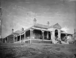 In July 1876, James Cowlishaw called tenders for a villa residence at Enoggera for William Wilson, which is understood to refer to Wilston House. Early photographs (circa late 1870s) show a core in face brickwork, with verandahs on three sides (to the west, south and east), a rendered masonry portico to the southern front entrance, a timber section along the north (rear) side of the house with a bay window at the eastern end, and an attached timber kitchen wing at the rear of the main building. The timber section of the house is understood to have contained one large room at the eastern end, divided by two sets of cedar doors from two smaller rooms, possibly guest bedrooms, at the western end. The cedar doors could be opened out to create a ballroom. Whether this wing was part of the original design, or a slightly later addition, is not clear. The portico to the front entrance may be a later addition, as the roof slates continue behind the portico roof structure. Slightly later photographs, thought to have been taken during the Wilsons' residence and therefore prior to 1885, reveal that the core had been rendered and bay windows to the two front rooms (at the southeast and southwest corners of the house) had been added. These matched in design the bay window of the earlier timber section on the north side of the house. By this period, three terraces on the southern (front) side of the house had been established, with concreted steps leading to each. It is understood that the lower terrace contained a croquet or tennis lawn, on which a portable dance floor and marquee could be erected when the Wilsons entertained.[1] The last event Willam Wilson held was the wedding of his stepdaughter, Margaret Coutts, on 20 December 1884 before heading on a trip to America and to his old home in Ireland.