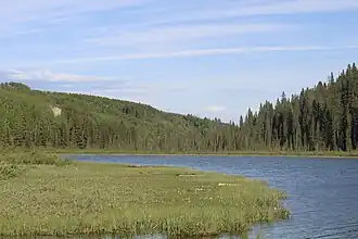 The lake and its surrounding area is home to a diverse array of plants and animals. There are at least 76 recorded bird species, with common ones including loons, waxwings, siskins, grosbeak, blue jays and multiple species of sparrows and warblers.[7] During the winter, northern pygmy-owl, great grey owl, and barred owl are sometimes seen.[7][8] Mammals include Moose, White-tailed deer, and Canadian beaver.[7][6] Common plants include bogbean, marsh cinquefoil, hooded lady's tresses, variegated yellow pond-lily, yellow lady's slipper, marsh grass of Parnassus, and Huron green orchid.