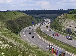 The core of the anticline is crossed by the M3 motorway, completed in the 1990s.[1] In order to avoid the Itchen Valley close to Winchester this cuts deeply through the younger beds to the north and south. Here the structure has dips of around 10° on the northern side and around 2° to the south.[2]