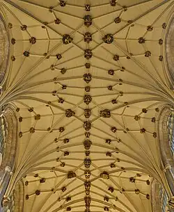 During the end of 2012, a high-level internal access scaffold was erected in the presbytery to enable close inspection of the vault and clerestory windows. The vault was subject to a detailed construction and paint analyses. The results of the inspection and analysis revealed severe corrosion in the windows, many of which had holes in and collapsed glass, and the failure of the lead roof above, which was causing degrading to the 16th-century wooden vault of the presbytery. A trial removal of the 1950s paint revealed the surviving 16th-century paint underneath on the nearly 200 roof bosses.[24] In July 2013, a £10.5 million grant from the Heritage Lottery Fund allowed the restoration work to begin.[25]