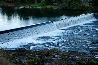 The Winchester Dam was made from large timber cribs. Originally, the dam was a mere four feet high, which was raised to sixteen feet in 1907. The dam was the main source of water and electricity for the town of Roseburg until 1923.[3] The dam's hydropower facilities have long since been removed, and the structure is now maintained solely for the recreational benefit of the Winchester Water Control District, composed of the private landowners surrounding the reservoir pool.[4]