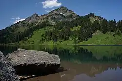 The trailhead for trail #685 to the top of Winchester Mountain is located between the two Twin Lakes. The steep trail, with a 1,300-foot (400 m) elevation gain, starts in beautiful tall treed forest with fantastic wildflower filled clearings and climbs high into the rough windswept and delicate alpine. There are two very narrow sections of trail with long drops that require sure footing are not for the faint of heart. The trail is 2.1 miles (3.4 km) one-way and rated "more difficult" by the U.S. Forest Service.[5]