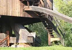 In the outdoor area of the Technology Museum stands another windmill, the Bohnsdorfer Bockwindmühle. This mill, approximately 14 meters high with door wings spanning a diameter of about 20 meters, is wind-powered, equipped with a grist mill and bag mechanism, and was occasionally in operation. During a visit to the mill in November 2022, the sails were no longer mounted, and the remains of one sail lay decayed on the ground nearby.[2]