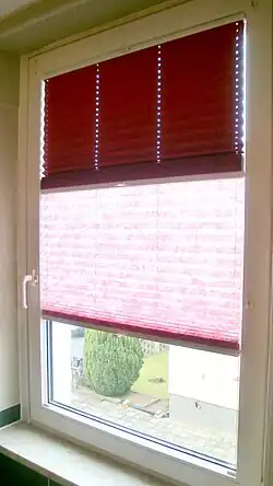 Cellular shades or cellular blinds, sometimes referred to as honeycomb shades, are a type of window blind made of a long and continuous fabric with a cellular structure when opened and fold onto themselves when closed. The honeycomb shades were introduced in 1985.[2] The fabric is often made from soft paper or cloth-like material and is available in a variety of different structures including single cell, double cell or triple cell. Cellular blinds work by trapping air inside the cell structure once opened and create a barrier between the window surface and the room. Due to the unavailability of standardized tests, no ranking system currently exists to compare the efficacy of these blinds.