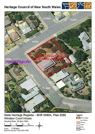 - ^ a b c d e f g h i j k l m n o p q r s t u v "Windsor Court House". New South Wales State Heritage Register. Department of Planning & Environment. H00804. Retrieved 11 October 2018.