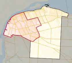 The district consists of the part of the city of Windsor lying west and south of a line drawn from the U.S. border southeast along Langlois Avenue, east along Tecumseh Road East, and southeast along Pillette Road to the southern city limit.