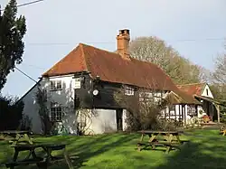 At Wyndham, usually called Wineham in the 20th century perhaps by assimilation to neighbouring Twineham, the houses are strung out on both sides of the road but mostly on the west, those on the east being in Twineham parish.[1] Wyndham hospital, founded in the 13th century, may have been near that road 0.25 miles (0.40 km) north of Frylands Lane, where the site was recorded in the 1870s, or the same stretch further north, where hospital field lies behind the Royal Oak; no trace of the building has been found.[1] The hospital had a church and a graveyard, and was presumably the place in Wyndham where an inquisition was held in about 1300.[1]