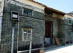 The enclosing wall was built in the Kangxi reign (1661-1722) of the Qing dynasty to safeguard the village from bandits, privates and other enemies. The entrance gate, originally located at the front wall of the village, on its central axis, was later relocated to the south due to feng shui reasons, after establishment of the nearby the walled village Tai Hong Wai. The moat was reclaimed in the 1960s.[3]