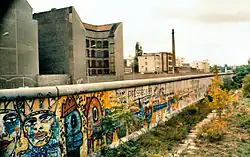 Filming took place at actual locations in West Berlin, such as the Siegessäule, Hans Scharoun's Berlin State Library,[25] Potsdamerplatz with the disused elevated track of the M-Bahn, the Lohmühlenbrücke, the Langenscheidtbrücke (the motorcycle accident), Oranienstrasse, Goebenstrasse 6 (where Damiel exchanges his breastplate for a loud check jacket), Waldemarstrasse (where Damiel comes to as a human), Günzelstrasse U-Bahn station, the Anhalter Bahnhof, Theodor-Wolff-Park (site of the circus), Hochbunker Pallasstrasse (Peter Falk's film set) and the Hotel Esplanade (the concert). Most shots of the Wall are genuine, although the set for the scene in the death strip, in which Damiel announces his decision to become human, was specially built.[25] Some pieces of the recreation were made from inexpensive wood, with one being destroyed by rain during production.[19]
