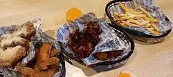 The menu includes a range of chicken products including bone-in and boneless wings, chicken tenders, chicken sandwiches. Sides include fries, fried corn, and veggie sticks (carrots and celery). Sauces include ranch, blue cheese, honey mustard, and cheese sauce. There are 13 wing sauces, with some sauces available for limited periods as part of marketing efforts.[23][24][25]
