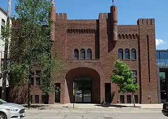 The Winona County History Center occupies a historic building itself. Originally constructed in 1915, the building served as the National Guard Armory until the Winona County Historical Society acquired it. The Armory's distinctive architecture, featuring castellations (decorative battlements), reflects its former military purpose. The symmetrical facade, resembling a medieval fortress, features a central "H" bay with an arched entrance, flanked by smaller bays with windows on multiple stories. Brick piers with round-arch slits and a corbel table top the parapet wall, giving a distinct medieval aesthetic. The 30,000-square-foot building once held a large, open room with a hardwood floor and balcony, dining room facilities, a shooting range, storage rooms and exercise rooms.[9]