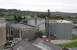 Winshill Water Tower is one of Burton upon Trent's most prominent buildings, visible on the skyline from far afield, and has been used as a landmark by road and rail travellers for decades.[1][2] It is constructed atop Scalpcliffe Hill, from which there are views across most of the town, and lies close to Winshill's boundary with Brizlincote parish.[1] The tower stands adjacent to a small section of woodland known as Waterloo Clump which was planted by local people to commemorate the Duke of Wellington's victory in 1815.[2] On the Brizlincote side of the hill an area of woodland, planted by the National Forest Company, has been named Tower Woods after the landmark.[3]