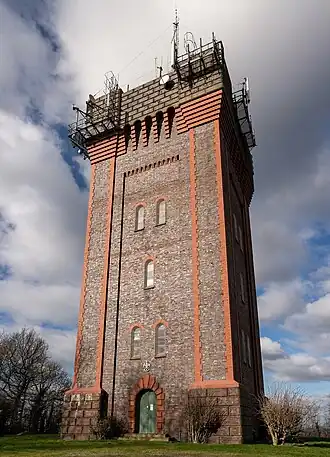 During the First World War local scouts mounted a guard on the tower, primarily as fire wardens, owing to the fear of German invasion or Zeppelin attack.[1] The town would become one of the first in Britain to be attacked by German strategic bombing when a Zeppelin raid of 31 January 1916 killed 15 people and wounded 72.[4] During the 1960s the South Staffordshire Waterworks Company installed aerials onto the tower as part of a short-wave radio system used by its engineers to contact the company headquarters.[2] Other antennas and mobile-phone masts have since been added, particularly since the tower lost its role in water supply in the 1990s. The tower remains in the ownership of South Staffordshire Water.[2][5]