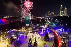 The Winter Festival of Lights in Niagara Falls, Ontario, is Canada's largest lights festival.[1] It runs from mid-November to mid-January and attracts over one million visitors annually.[2] The event has free admission while accepting voluntary donations. As of 2023, it features a decorated eight-kilometre route along the Niagara Parkway that extends into the tourist districts and the Dufferin Islands.[3] The lights are installed and run by Ontario Power Generation.[4]