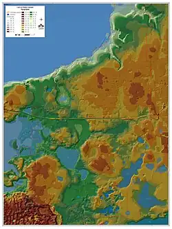 The terrain is characterized by a gentle to moderately sloping topography. Winter Garden has the highest elevation spot in Orange County. The highest elevation is 222 feet (68 m) in NAVD 88 (North American Vertical Datum) located in the southwest corner of the city South near the county line with Lake County. The lowest elevation in the city is 64 feet (20 m) near Lake Apopka.