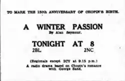 Winter Passion is a 1960 Australian radio play by Alan Seymour about the relationship between Chopin and George Sand on the island of Majorca. It was written to celebrate the Chopin sesquicentenary.[1]