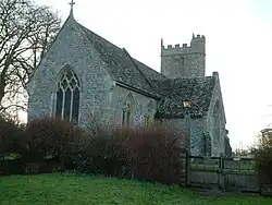 The nave and chancel are in random sarsen while the 15th-century four-stage west tower is in limestone ashlar. Many of the furnishings, including the oak pulpit and reader's desk, are 17th-century. Renovation in 1857-8 saw replacement of the roofs, but the rest of the structure and most of the windows were retained; the northwest window of the chancel has fragments of 14th or 15th-century glass.[11] There are three bells, one cast in 1583 and the others in the 19th century.[12] The church was designated as Grade I listed in 1958.[10]